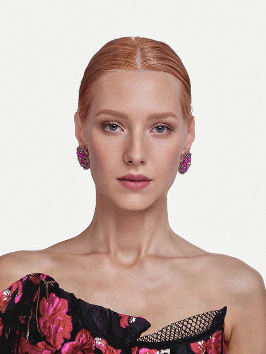 Hot Pink and Gold Hand Beaded Stud Earrings