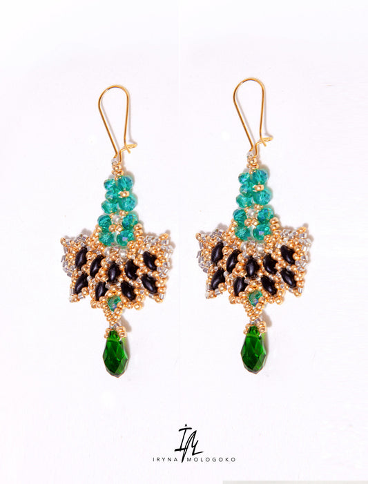 Emerald Green and Gold Hand Beaded Stud Earrings