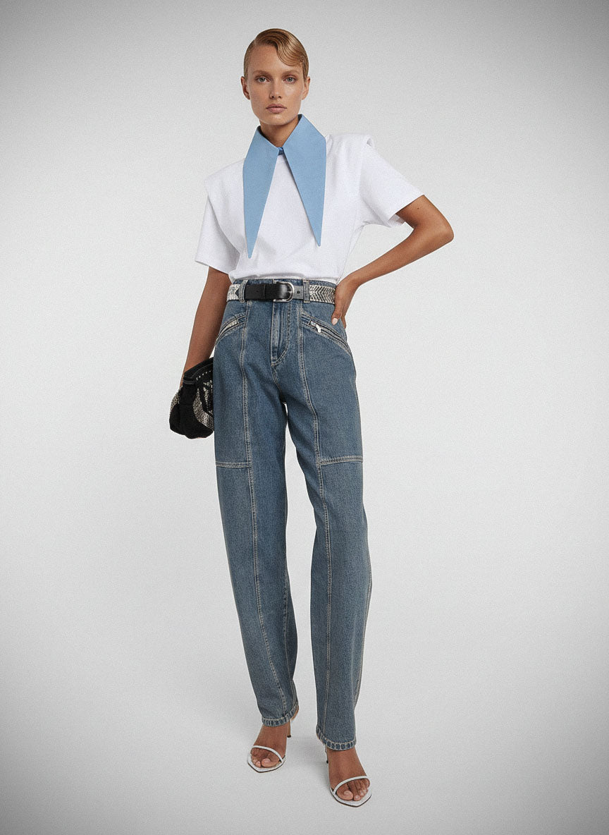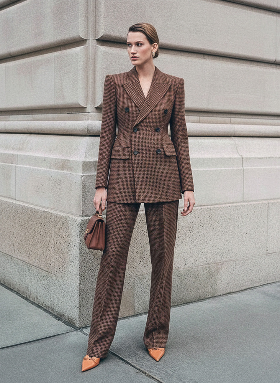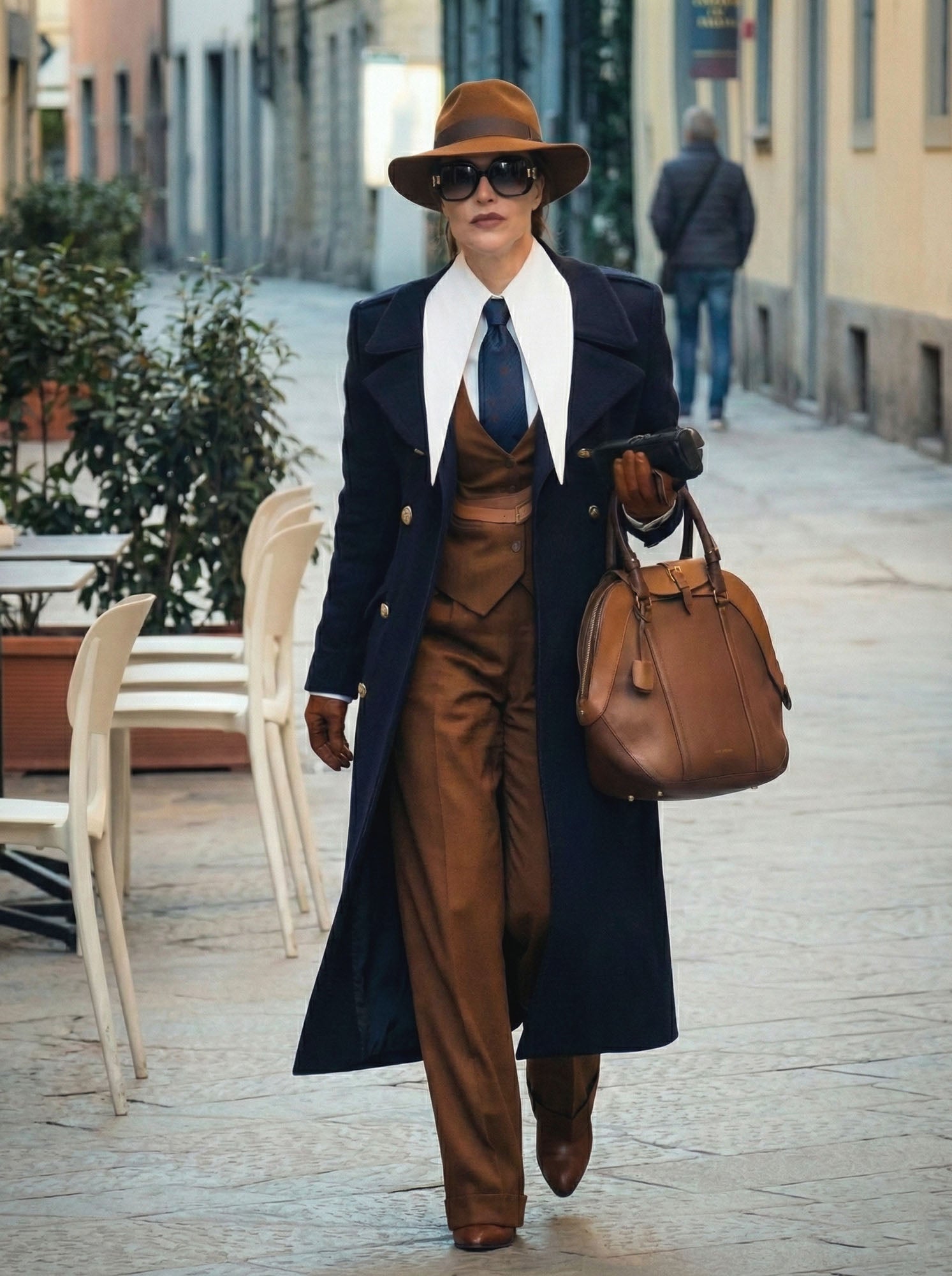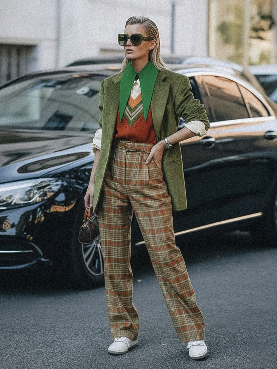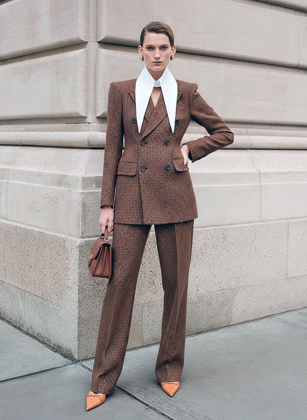 - The Bottoms: High-waisted trousers with a wide leg or a sharp pencil skirt to maintain the verticality created by the collar tips.