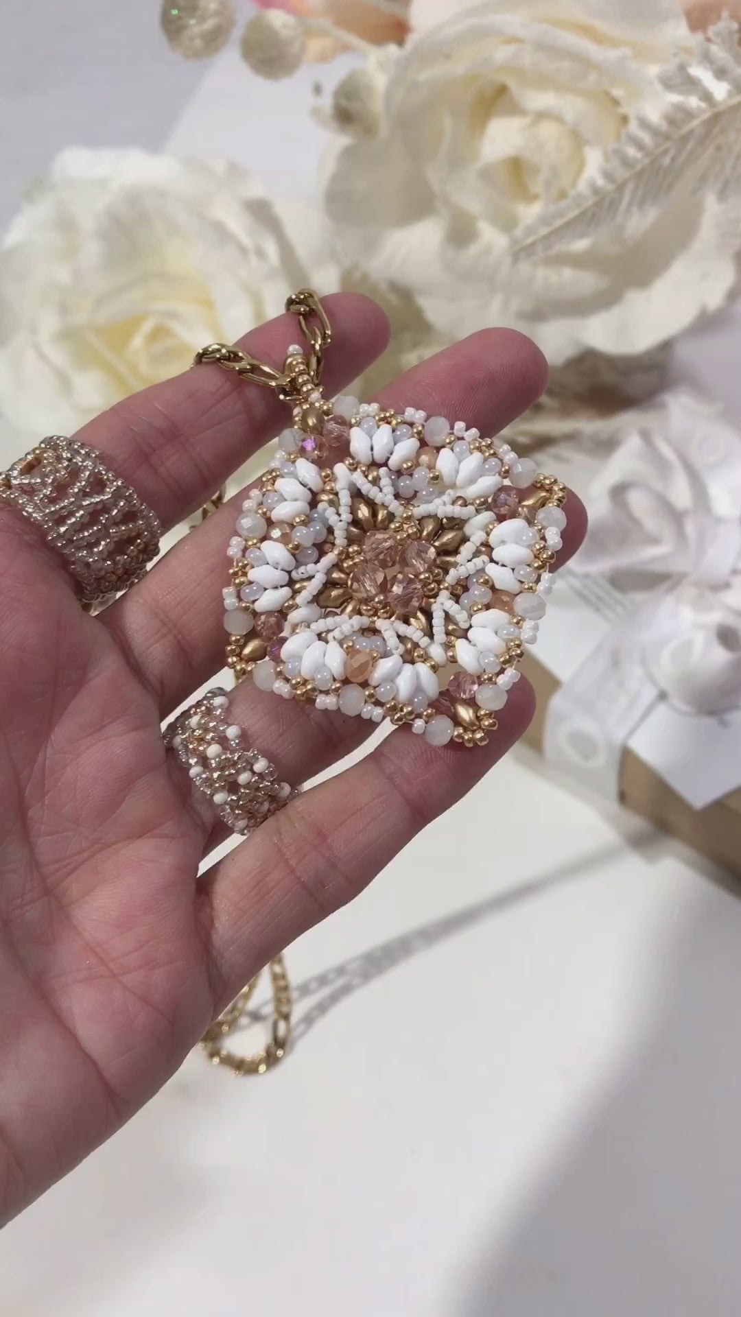 The intricate beading work creates a unique texture and pattern, which is both bold and elegant at the same time. The pendant is available in two classic color combinations of gold and white, making it versatile enough to pair with any outfit.